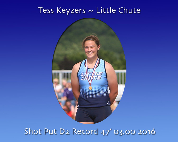 Keyzers is a 3 sport athlete [VB, BB, and track and field] and is the school record holder in the SP [47' 03] and was a runner on the school record setting 4x400m [4:03.58]. She is #6 on the All-Time SP list and was All State in 2015 and 2016.