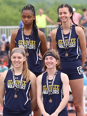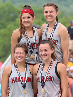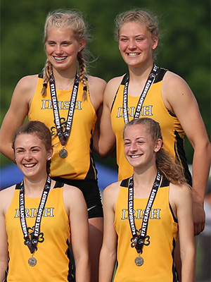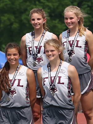 | The D2 4x8 Gold Medal winners from Osceola posted a 9:30.69. Runners above L-R: Alli Fogelberg, Lauren Ellefson, Caroline Gearin, and Katie Haase. |