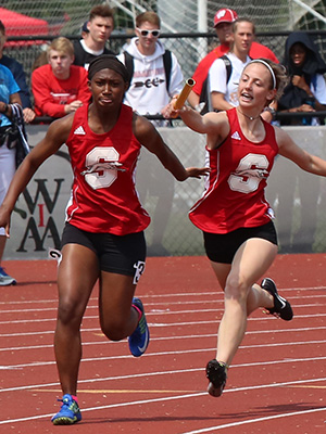 | Rosie Cramer looks on as anchor Makayla Jackson jets to the finish line and a 46.70 [46.54 in prelims] clocking earning Milwaukee King the Gold Medal in the 4x100m relay | ||