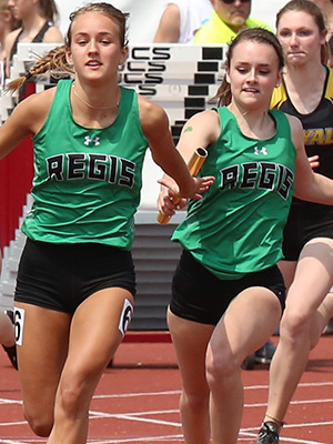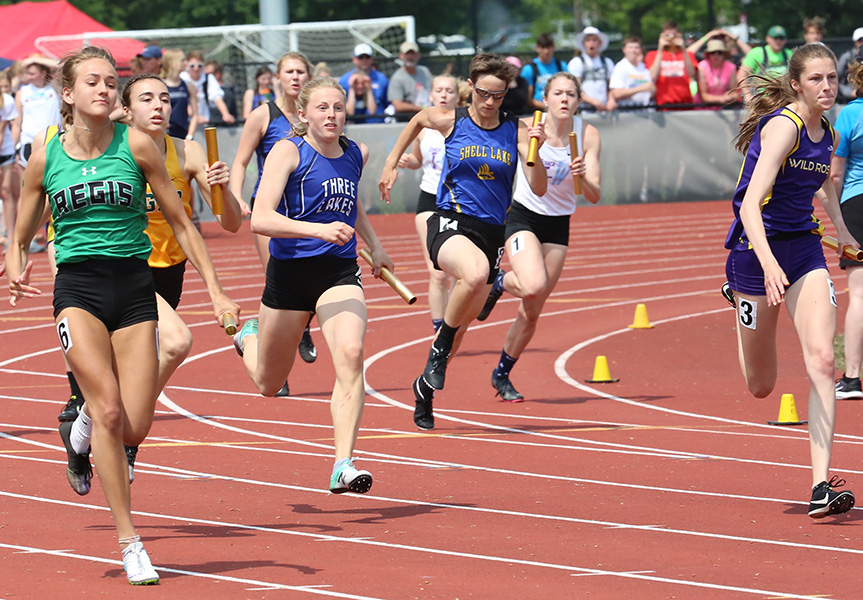 | Three Lakes/Phelps anchor Kortnie Volk has some ground to make up at the final exchange of the D3 4x1 race. Three Lakes nosed out Manawa 50.32 to 50.42 for the Gold Medal. Manawa anchor Aspen Linjer [far left] turned on the jets to surprise everyone with a second place finish . Manawa had qualified 8th for finals. Regis finished third- Regis anchor Bria Thalacker is shown getting the baton from Josie Stender. | ||