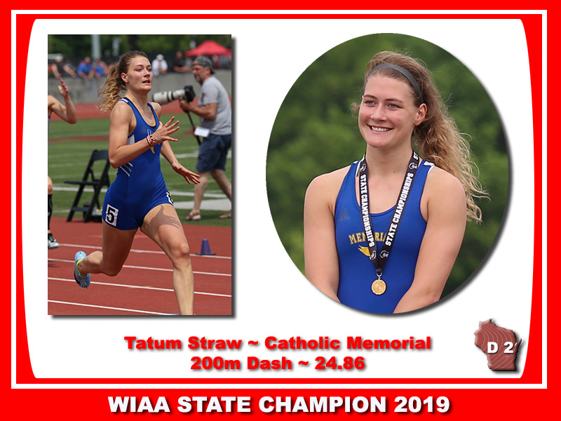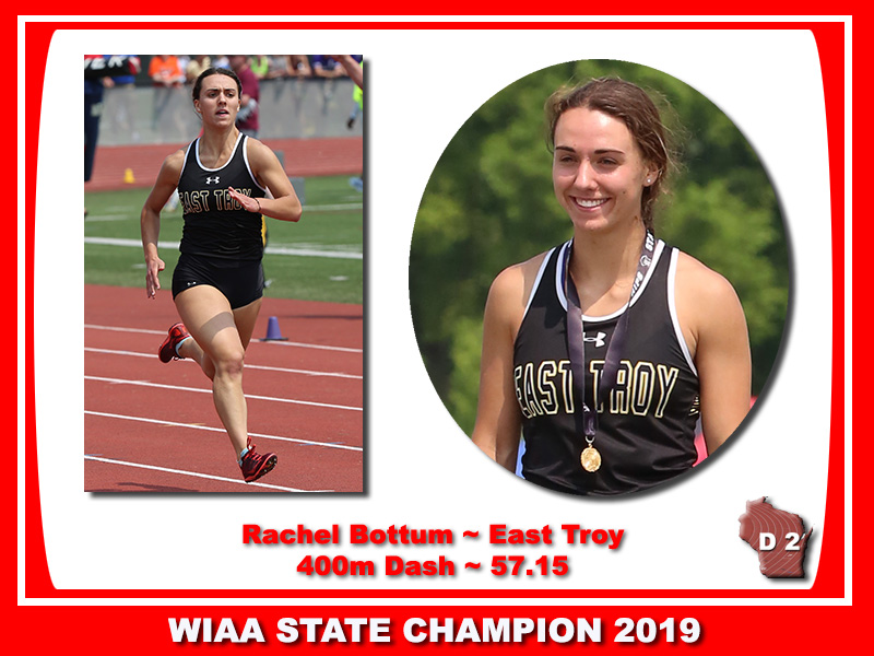 | WIAA 2019 D2 Champions Tatum Straw [200m, Catholic Memorial], Rachel Bottom [400m, East Troy], Leah Kralovetz [1600m, 3200m, Denmark], and Mackenzie Heyroth [100m HH, 300m LH, Lodi], have graduated. |