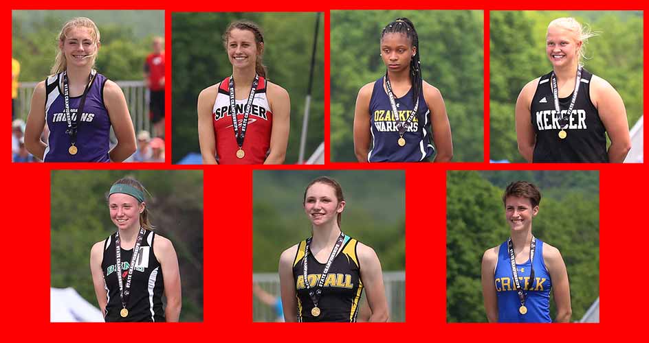 | Returning Champions From 2019 Top row L-R: Miranda Firari [Dodgeland, PV], Hannah Zastrow [HH], Delany McFadden, [ Ozaukee, 200m], and Aubrey Schoeneman [Mercer, SP]. Bottom row L-R: Kayci Martensen [BSMS, 1600m, 3200m], Jessica Bruggeman [Royall, LJ, TJ], and Hannah Constable [Johnson Creek, 400m, 800m]. |