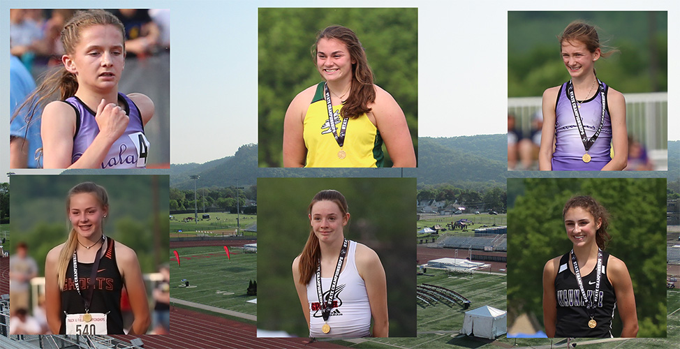 | Returning Individual Champions From 2019 Top row L-R: Amalia Malecek [Onalaska, 1600], Dani Langseth [DC Everest, SP & Discus], and Kora Malecek [Onalaska, 3200m]. Bottom row L-R: Olivia Van Zeeland [Kaukauna, HJ], Roisin Wills [Stevens Point, 800m, 4x400m], and Chloe Larsen [Waunakee, 400m]. |