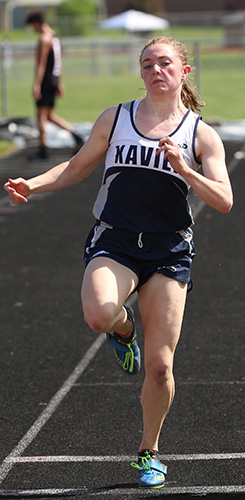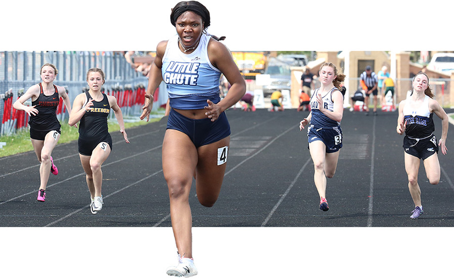 | Little Chute's Alyssa Hutcherson is shown above winning the 100m dash event [12.70]. Other runners shown in the finals are L-R: Emma Sippel [Kaukauna, 5th], Grace Hambel [Freedom, 2nd, 12.80], Hutcherson, Xavier's Kylie McCormick [4th], and Danika Apple [Notre Dame Academy, 3rd]. | ||