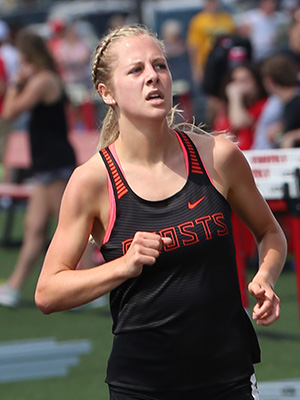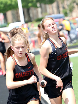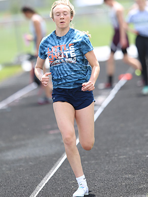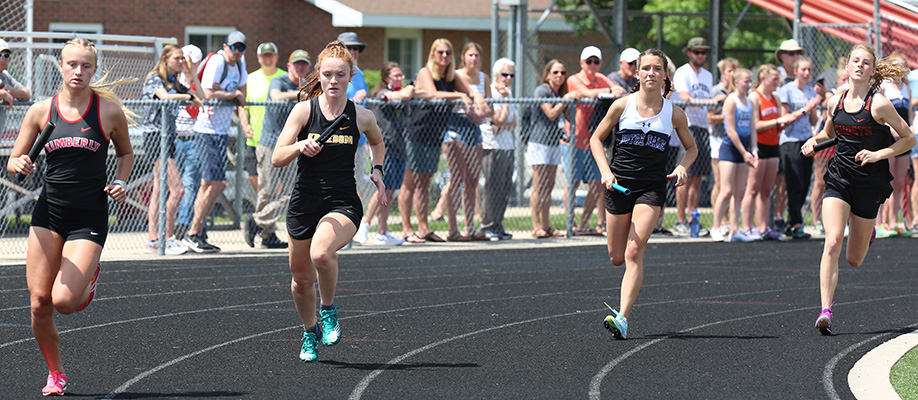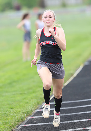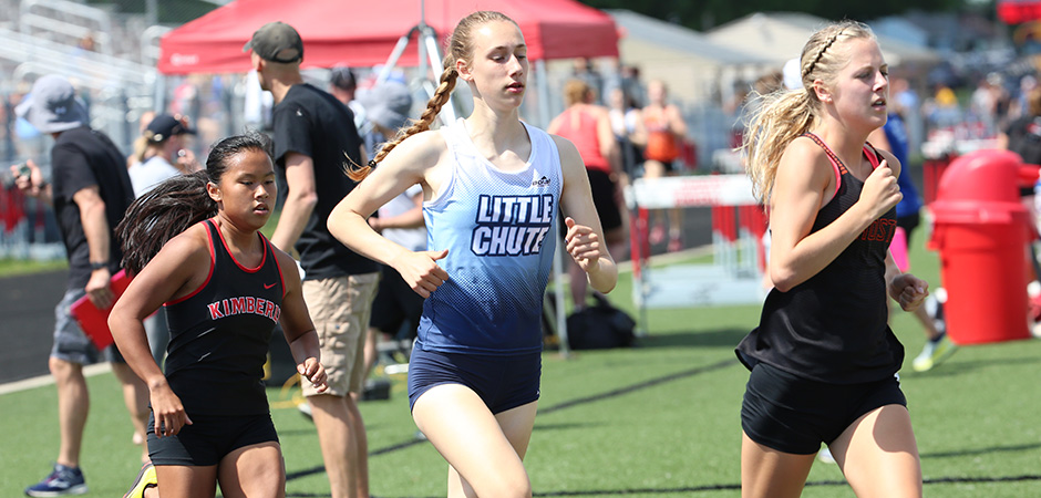 | Kaukauna's Anna Fauske had a busy day winning the 1600m [5:12.49] and 3200m [11:19.97] on a very hot and humid day. 1600m runners shown above L-R: Danielle Van Grinsven [Kimberly, 2nd], Jessica Wilson [Little Chute, 4th], and Anna Fauske. Fauske broke the old record of 5:12.67 which she had set at the 2019 Gil Frank Invite. | ||