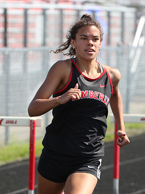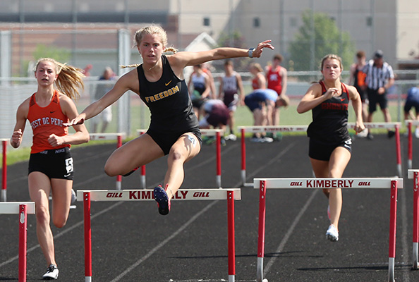 | Sam Bartels from Freedom won the 300m LH in 47.85. In the early part of the race shown above Bartels is seen taking the lead. Also shown are Ellie Drews [West De Pere, 3rd] and Ellie Davis [Kaukauna, 7th]. | ||