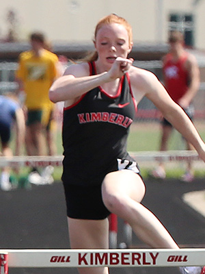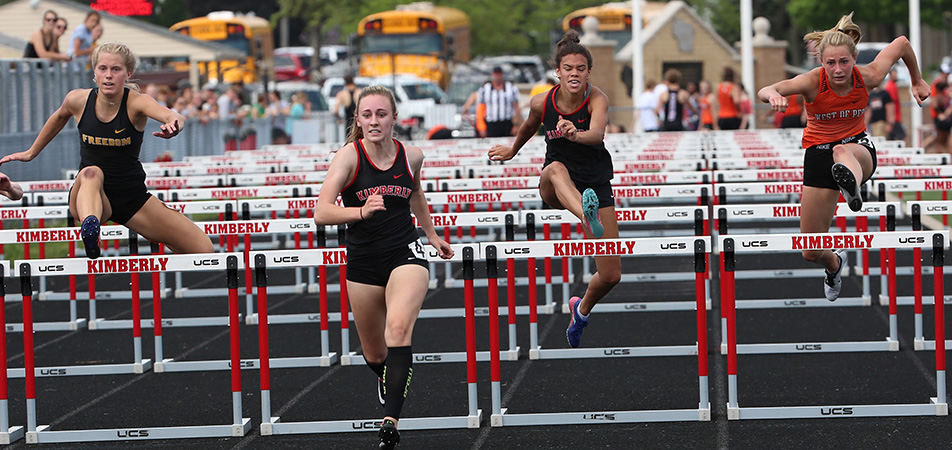 | In addition to winning the TJ event Kimberly senior Hanna Reichenberger won the 100m HH event [16.43]. In the finals above L-R: Sam Bartels [Freedom, 2nd, 16.80], Reichenberger, Kendall Diedrick [Kimberly, 4th], and Ellie Drews [West De Pere, 5th]. Not shown [lane 6] is Kimberly hurdler Madison Weyenberg who was 3rd. | ||