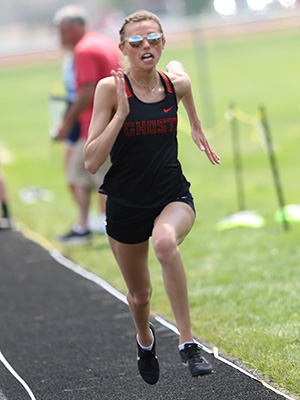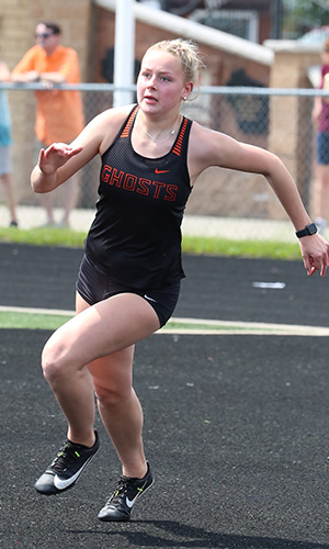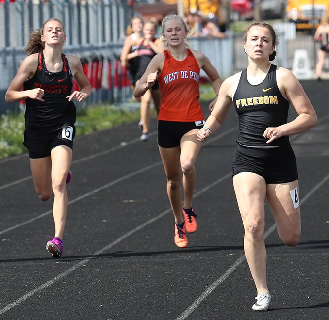 | Freedom junior Grace Hambel [#4]raced to a clocking of 59.30 in the 400m dash event to set a new Gil Frank Invite record. The old record was set in 1980 by Kelly Ausloos from New Holstein [1:00.14]. Other runners shown above are Alexa Kinas [#6] [Kaukauna, 2nd] and West De Pere sprinter Jocelyn Thompson. | ||