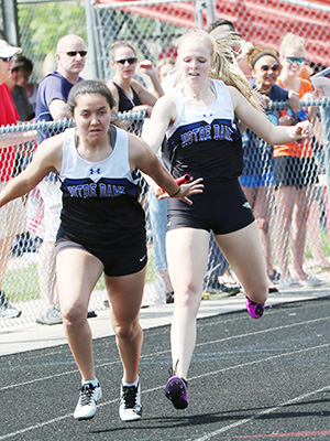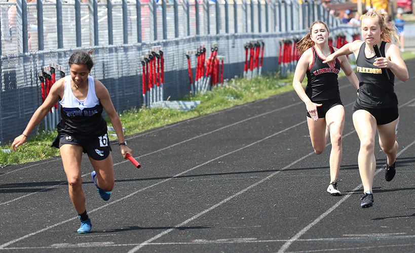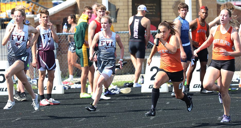| Fox Valley Lutheran was second in the 4x100m relay. FVA leg 3 runner Courtney Kufahl approaches FVA anchor Annalise Patchett. The final exchange photo above shows West De Pere's Eliza Aitken accelerating after getting the baton from Jayna Schema. | ||