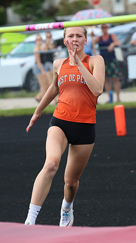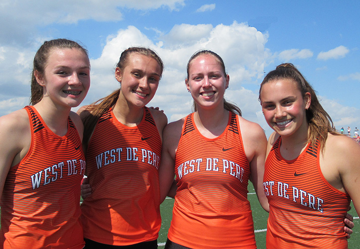 | West De Pere's 4x1 relay won that event by posting a 50.88. Runners L-R: Faith Kibbe, Lilah, Peterson, Jayna Schema, and anchor Eliza Aitken. Eliza Aiken also won the PV event with a vault of 11' 00. This set a new record breaking the old record of 10' 00 held by three vaulters [Sabrina Wolter-Xavier 2012, Sara DeGroot -Kimberly 2018, and Amber Tomazevic -Freedom 2019]. | ||