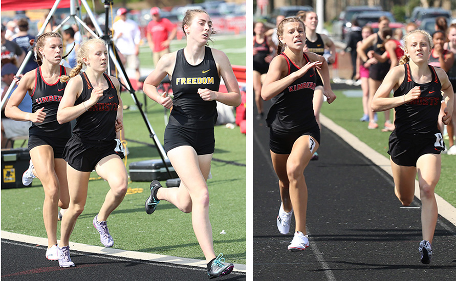 | Ninth grader Jillian Krueger [3rd above far left] from Kimberly won the 800m run event in 2:22.83. She edged Kaukauna's Kailin Kinas [2:22.96]. Kinas is sown above right [#1]. In the photo on the left L-R: Krueger, Kinas, and Freedom's Gwen Hinz [3rd]. In the photo above right Krueger and Kinas are shown approaching the finish line. | ||