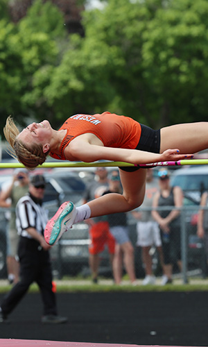 | West De Pere's Madeline Zirbel [left and center] won the HJ [5' 05.50]. Her jump broke the old record of 5' 05 previously set by Laura Salm of Little Chute in 1988. Olivia Van Zeeland [right] from Kaukauna finished 2nd in 5' 04. | ||