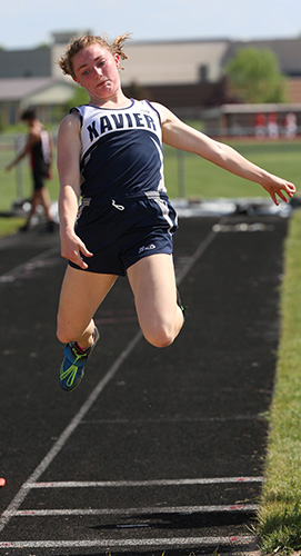 | Kylie McCormick from Xavier [left and center] the current D2 leader on the Honor Roll LJ won that event with a distance of 18' 00.50. Kimberly's Hanna Reichenberger won the TJ event [37' 03.00]. | ||