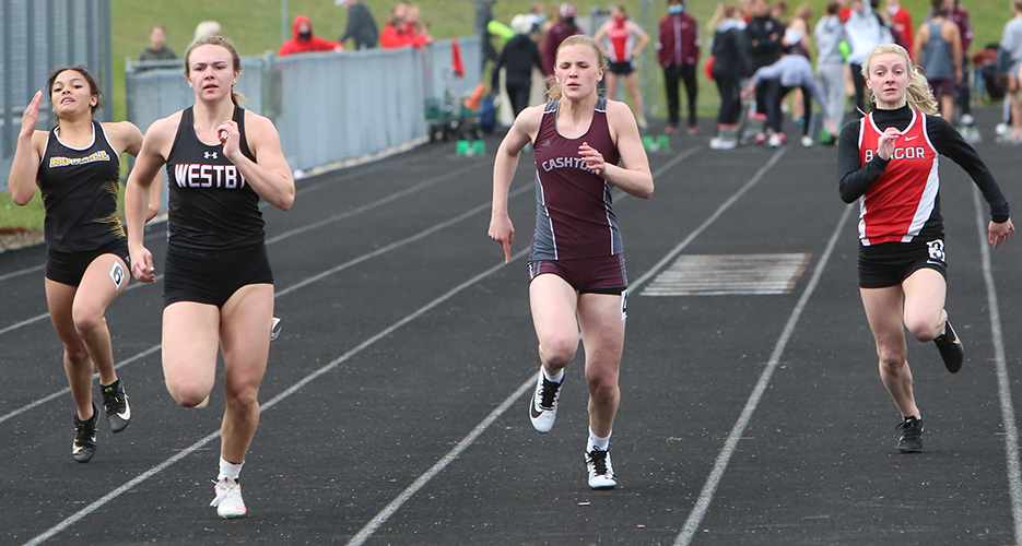 | Finals Of The 100m Dash L-R: Madeline Wainwright [Royall, 4th], winner Grace Hebel [Westby,13.19], Braylee Hyatt [Cashton [2nd], and Bangor's Megan Marr [3rd] |