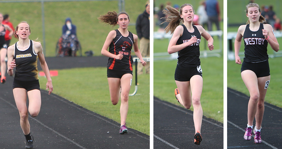 | 1600m runners L-R: Marah Gruen [Royall, 1st, 5:43.87], Alena Donahue [West Salem [2nd], Audra Johnson [Westby, 3rd], and Denali Huebner [Westby,4th]. |