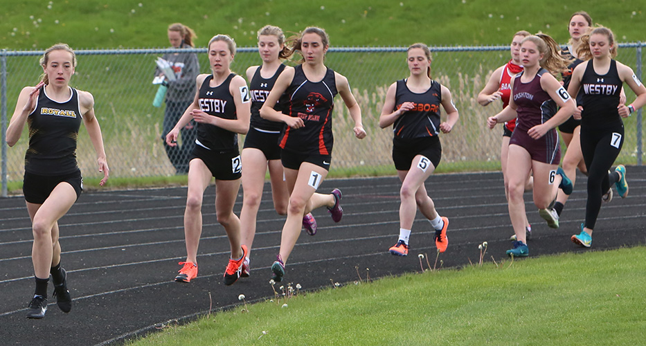 | First Lap of the 1600m shows Marah Gruen a ninth grader from Royall taking an early lead. Gruen held on for first place and also placed 4th in the TJ and third in the LJ events. |