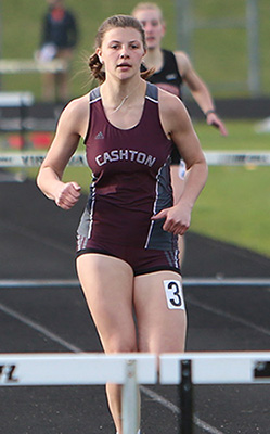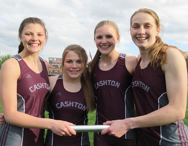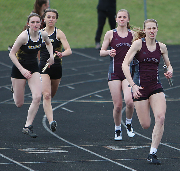 | The Top 2 D3 4x1 teams [as of May 10 ] competed at the Blackhawk Invitational. Cashton edged out Royall 52.12 to 52.79 for the win. Cashton runners L-R: Adelynn Hyatt, Jaiden Hansberry, Braylee Hyatt, and anchor Annie Schreier. Note-Schreier also won the SP [34' 03] |