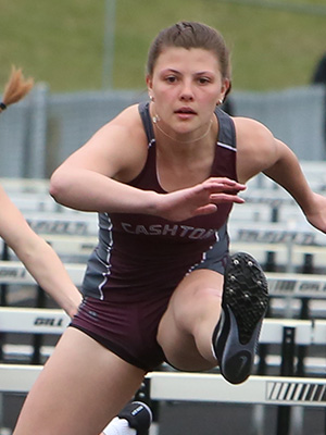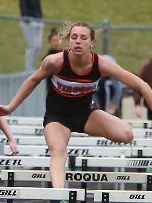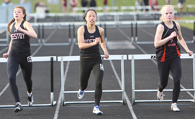 | 300m Low Hurdle Athletes L-R: Teagan Rooney [Westby, 4th], Meghan Nelson [Westby, 2nd], Maddie Wopat [West Salem, 3rd], and winner Adelynn Hyatt [Cashton, 48.59]. |