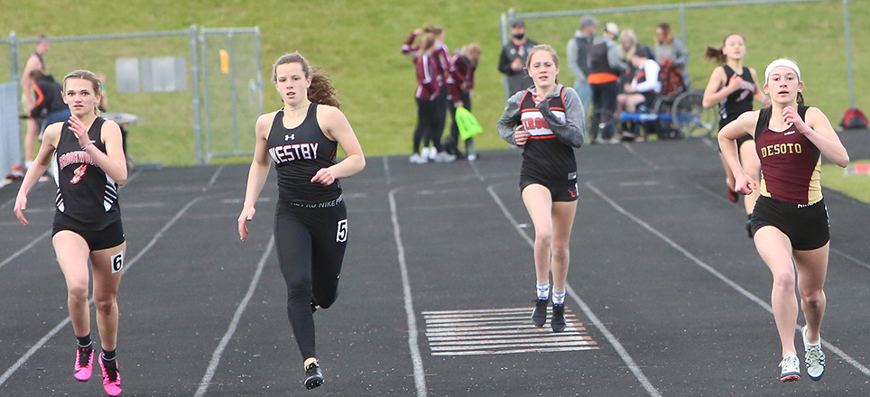 | 400m Dash Runners L-R: Autumn Brandau [Brookwood, 3rd], Ali Weninger [Westby, 2nd], Linnea Peterson [Viroqua, 4th], and winner Trinity Vento from De Soto [1:05.32]. |