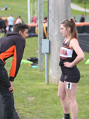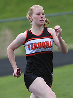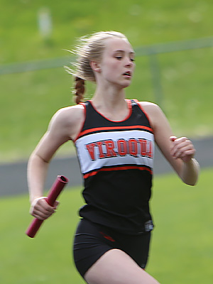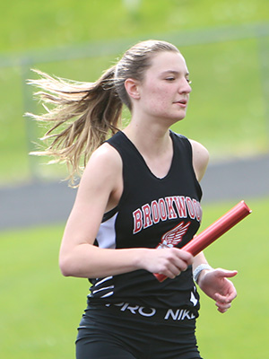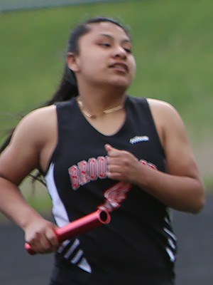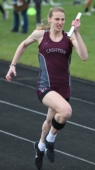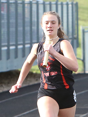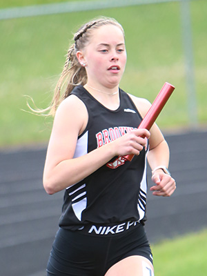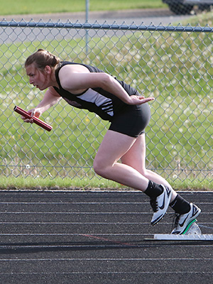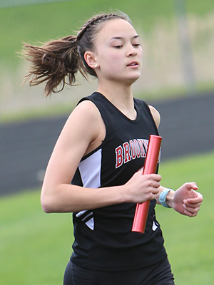 | Left: Final exchange in the 4x1 shows anchors Jessica Brueggeman [L] and Annie Schreier [R] getting the baton from leg 3 runners Emma Gruen [Royall] and Braylee Hyatt [Cashton]. Right: Cashton anchor Annie Schreier. | ||