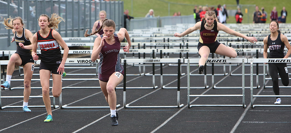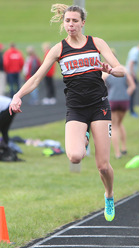 Head Coach Adrian Ugo and his staff hosted the annual Blackhawk Varsity Invitational at Viroqua's athletic field and track. D2 Bangor, Brookwood, Cashton, De Soto, Hillsboro, and Royall, along with D2 West Salem, Westby Area High School, and host Viroqua competed on a col clear night. Westby outpointed Royall 144 to 114.5 for the team title. Westby's Grace Hebel won the 100, 200, and LJ events while Cashton's Adelynn Hyatt was a triple winner in the HH, LL, and 4x1 relay events. Defending State Champion Jessic Brueggemen the D3 record holder in the LJ and TJ won the TJ event with a distance of 35' 04. In the HH finals above Emma Gruen [Royall, 3rd], Katrina Koppa [Viroqua, 2nd] and Cashton's Adelynn Hyatt [1st in 15.84] were the top finishers. |