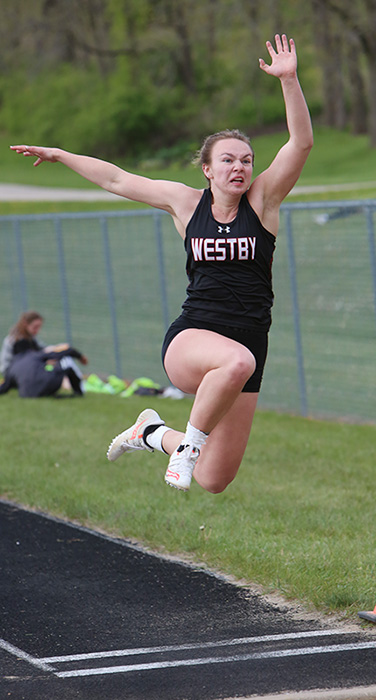 | Left: Long jump winner Grace Hebel [Westby, 16' 03]. Right: TJ winner Jesscia Brueggeman [Royall, 35' 04, shown in LJ]. Bruggeman was 2nd in the LJ while Hebel was 2nd in the TJ. |