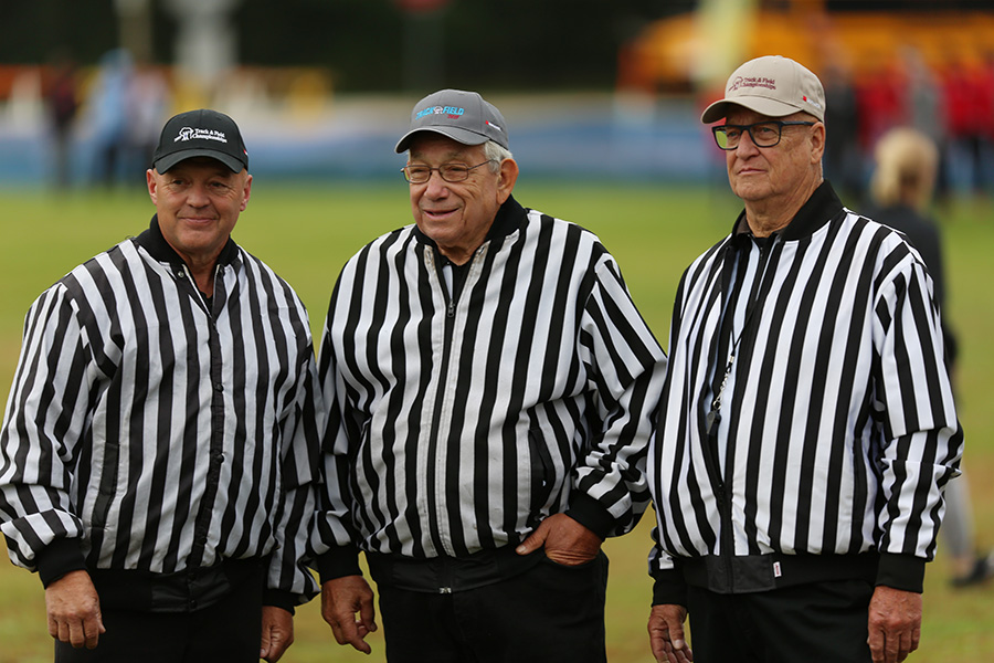| Track official Robert Kern at the 2009 W/TFA Meet at UW-Whitewater L-R: LJ judge Dennis Rue, official Robert Kern, and Kimberly's Sam Blue. |