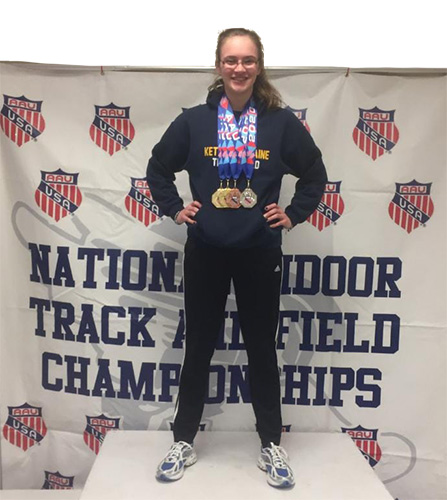 | 2020 AAU Northern Indoor National Championships U16 Division At Monmouth College Ellie Johnson finished as the: 60m Hurdles Champion, Shot put Champion, 2nd in the LJ, and 4th in the 200m dash. Photo by M. Johnson |