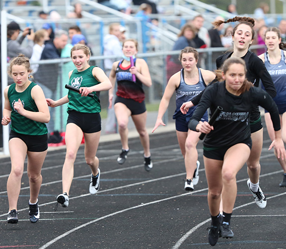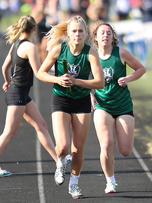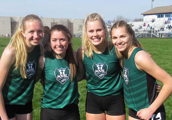| The Keetle Moraine Lutheran 4x8 relay won that event in 10:25.62 Team members L-R: Abby Poehlman, Reegan Siegel, Savannah Huckstorf and anchor Alexa Schwalenberg. |
