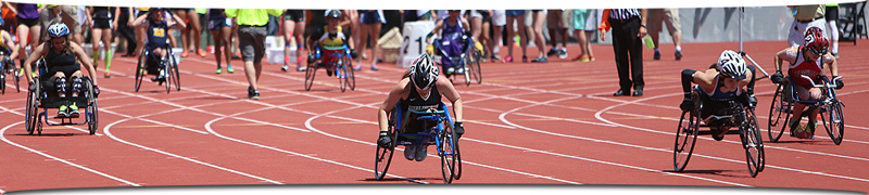 Rules Of Competition: Schools are expected to notify the host school (of the meet) 24 hours prior to the scheduled meet that they intend to have a wheeled athlete competing. All wheeled athletes must compete in separate races from able-bodied athletes. All track events should be coed whenever possible. For 100 meter wheelchair races, one lane should be left open between athletes. For all other wheelchair races, the lane assignments and seeding procedures will be the same as the procedures for able-bodied races. Wheeled athletes competing in the shot put may be included with the able-bodied athletes but are considered exhibition. Propulsion and steering of the wheelchair must be with the hands and arms only. All wheels of the wheelchair must be completely behind the vertical plane of the starting line. Starting commands would be "Wheelers Set", followed by the firing of the starting device. If an unsafe situation or mechanical failure should occur during a race, a competitor may be assisted back into his/her chair by a bystander in order to continue racing, if requested by the athlete. The finish is determined by the front wheels breaking the vertical plane of the finish line. For the shot put; the event chair must remain stationary during competition. The athlete may have an individual hold the chair during the throw to prevent excessive movement.