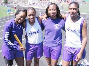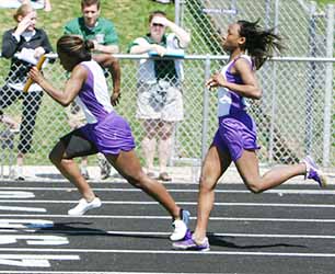 Above: Milwaukee Bradley Tech's relay team won the Crusader Classic 4x1 with a time of 50.33. Team members were [L-R] Linnelle Clark, Jasmyn Hudgins, Nadia White and Carshella Porter. Above Right: Nadia White [R] hands off to teammate Linelle Clark on last leg of their relay.