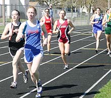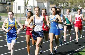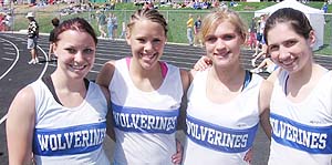 The Wolverines of Waukesha West won the 4x2 relay with a time of 1:46.85. Team members [L-R] were Jenna Sitte, Erin Dian, Courtney Craig and Kate Maasz. On the right is pictured Jenna Sitte running the anchor leg of the 4X2. Waukesha West also won the 4x8 [9:49.46] and the 4x4 relays [ 4:10.77]. Below are pictures from heat 1 of the 4x8 relay event.