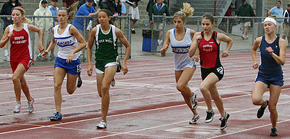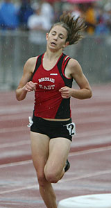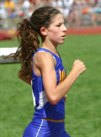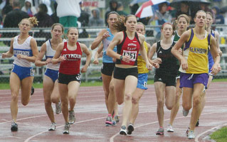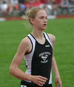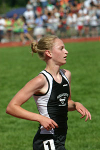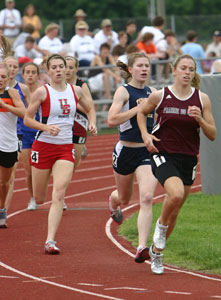 Above: Start of the D1 1600m [L-R] Lauren Kleppin [South Milwaukee], Katie McCormack [Brookfierld Central], Cathy Randle [Wauwatosa West], Alyssa Beste [Waukesha West], Kate Sanft [Wausau East], and Katie Cumming [Hudson]. Right: D1 1600m winner Kate Sanft [4:56.77] a junior from Wausau East. |