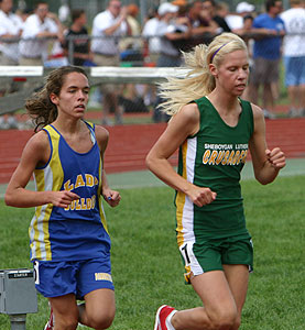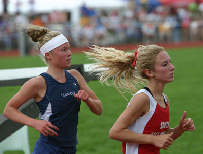 Above left: 3200m D1 winner Hudson junior Katie Cumming [10:57.77] and South Milwaukee senior Lauren Kleppin [3rd, 11:01.59]. Above right: [L-R] La Crosse Central senior Alexa Renstrom [2nd, 11:00.37] and Cumming. |