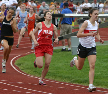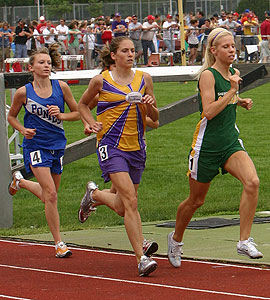 Left: D2 800m [L-R] Union Grove senior Jil Kerkman [ 2nd, 2:16.58], senior Sarah Sudbury of Tomahawk [3rd, 2:17.01] and 2006 D2 800m winner Diedre Dillman a junior from Prairie du Chien who repeated as champion with a time of 2:15.15.
