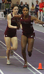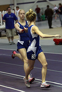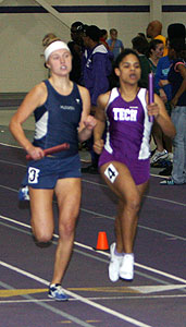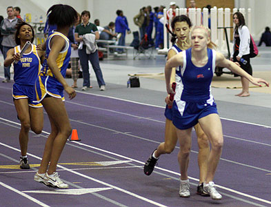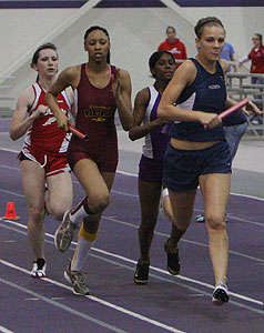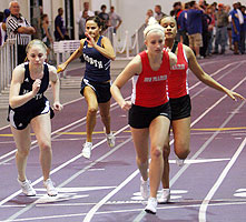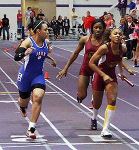 Long time track and field coach and TFA official Don Loker of Madison looks on as relay teams from Milwaukee Riverside University and Menomonee Falls exchange batons in the 4x2 relay event. Runners Charde Mayne of the Riverside Tigers and Calanetta Burrows of Menomonee Falls hand off to teammates in the first exchange of their 4x2 race.