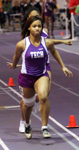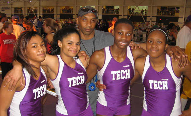 Tech's time was a blistering 1:43.68. Members of the record setting realy team are: [L-R] Dezerea Bryant, Symona Bryant, Sharonda York and Jasmyn Hudgins. In the back is Milwaukee Tech's sprint and relay coach Ray Hale.