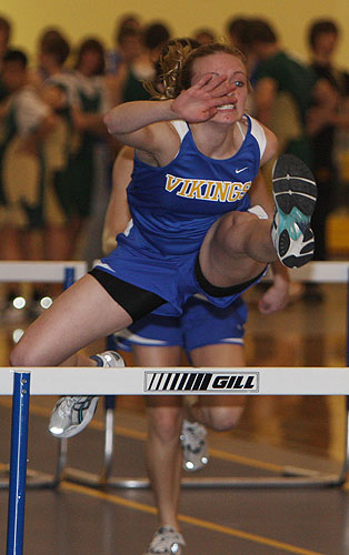 Above right: 1600m runners [L-R] Katy Schahczinski [Greenfield], Callie Sterle [East Troy], Val Kehl [East Troy], and Taylor Christianson [New Berlin West]. Below left: Katie Hausmann 55m hurdle winner. Below right [L-R] Second place finisher Callie Sterle [East Troy] in the 1600m and 1600m winner from East Troy Val Kehl.