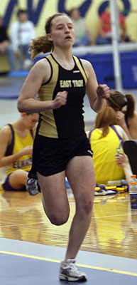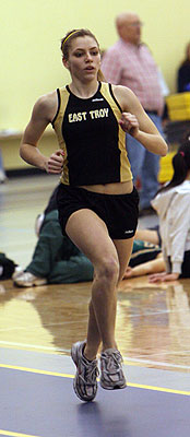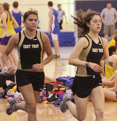 Left [L-R]: East Troy 400m runner Katie Isleb. The winner of the 400m was Tia Nowak [JR] of East Troy.
