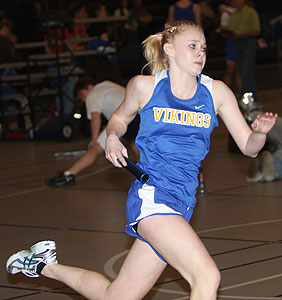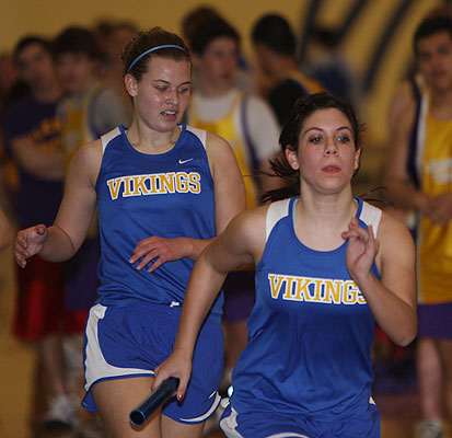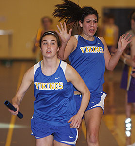 Above: 4x8 anchor Brynn Devine from the Vikings of New Berlin West takes the baton from Haily Roebels. Right: Andrea Gableman the second runner in West's 4x8 hands off to Roebels. Leadoff runner Ashley Ihme is pictured below left. |