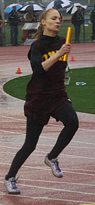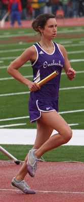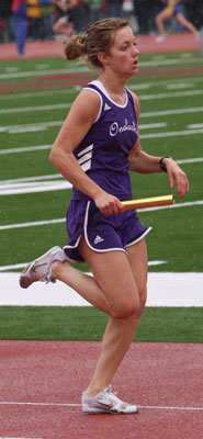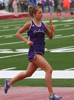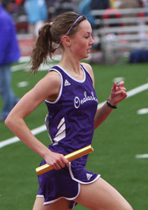 Left: Omro anchor Amanda Obot in the 4x2 finals in the rain on Saturday. Omro had the second best qualifying time on Friday and ran to the win in the Saturday 4x2 finals. |