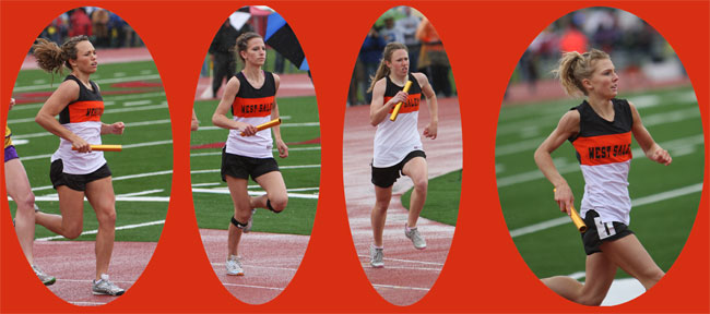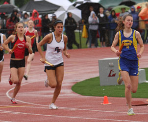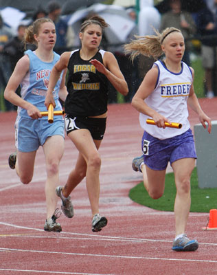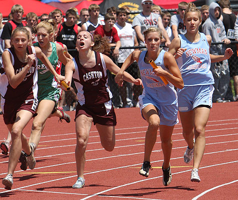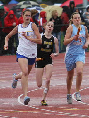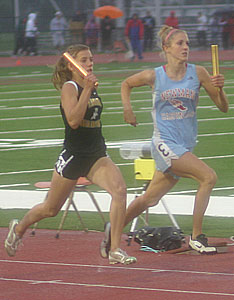 Left: In Saturday's 4x4 finals Edgar's Tessa Thurs and Newman's Emily Schuster are even on the homestretch. Edgar won with a time of 4:05.82. Newman Catholic was second in 4:05.85.
