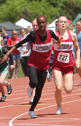 Far left: In the 4x1 preliminaries Lutheran's Alex Schad [#727] hands off to anchor Chelsea Jordan in the Friday preliminary 4x1 relay race.