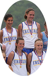 The Hilltoppers won the 4x8 relay in 9:23.88. L-R: Jamie Burr, Maddie Huebschman, Katie Hill, and Jami Hill [Below].