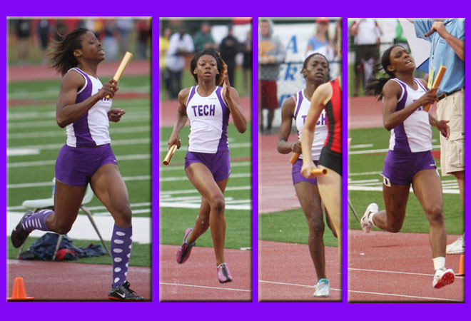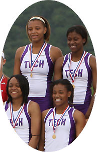In the 4x4 preliminaries the Milwaukee Bradley Technical quartet [Above L-R] of Elexis Fuller-Stewart, Tahje Whittley, Dinah Watts, and Tiffany Matthews set a new D1 and All-Division record by blazing to a time of 3:53.64. This broke Milwaukee North's record of 3:55.19 set in 1980.
