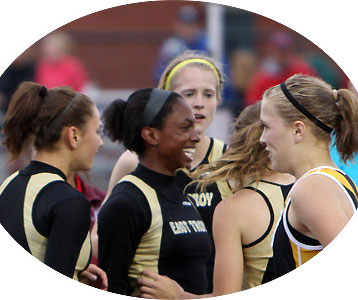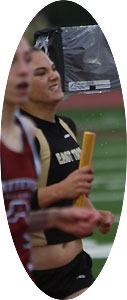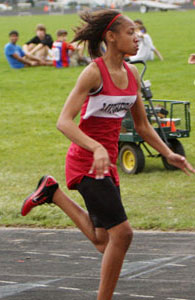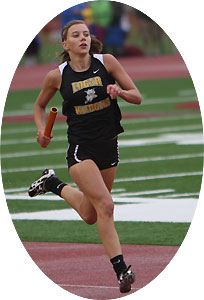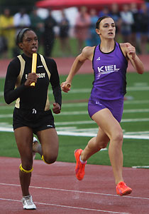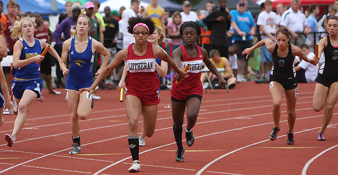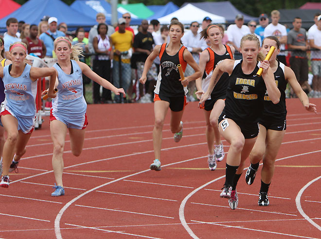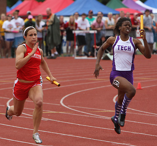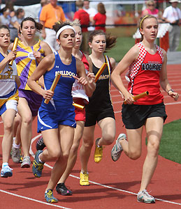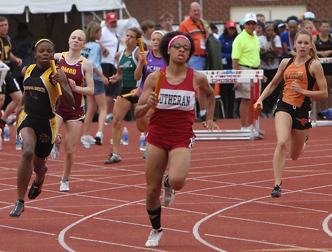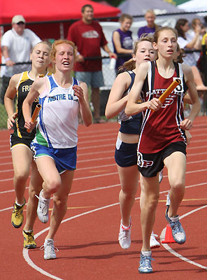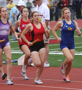 Milwaukee Lutheran scored 40 points in D2 to finish second behind 2010 Champion Green Bay Notre Dame who scored 45 points. The Red Knights from Milwaukee won the 4x1 and 4x2 relays. The 4x1 team is pictured above in the finals as Charese Hampton gives the baton to anchor Raynna Thompson. Waukesha Catholic Memorial finished second while Somerset [Black jerseys] finished fourth in the 4x1.