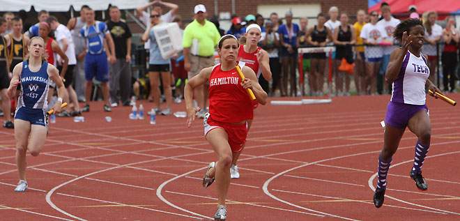 In the finals of the 4x1 pictured above anchors [L-R] Heather Bong [Arrowhead], Danielle Barbian [Hamilton], Dezerea Bryant [Milwaukee Bradley Technical], and Hannah Rhode [Waukesha West] head into the straightaway.
