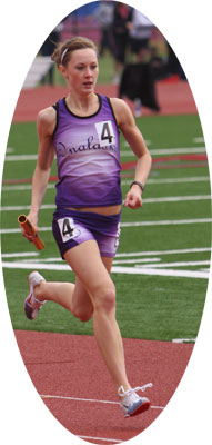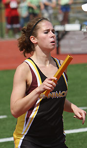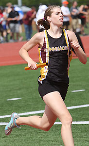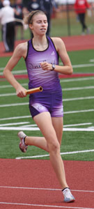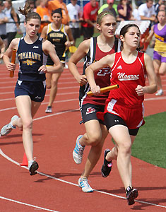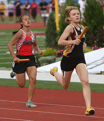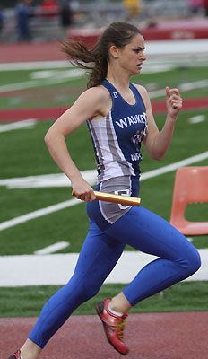Raynna Thomson is shown above anchoring the 4x2 in the Saturday finals. Brown Deer was second [anchor Ariel Kinlow, far left], Bloomer third [anchor Jaime Ludwigson, far right - orange jersey], and Omro fourth [anchor Amanda Obot].