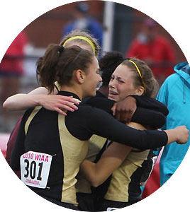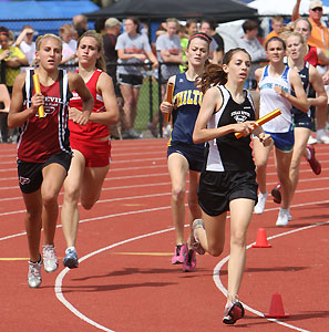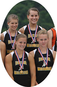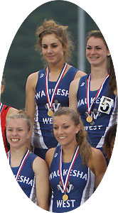 In the D1 4x4 finals the Wolverines of Waukesha West finished ahead of Bradley Technical by posting a time of 3:57.31 to Tech's 3:58.99 clocking. West's team above: Top L-R: Kristin Heckel and anchor Lauren Grant. Bottom L-R: Emily Duffy and Halley Ahler. Grant is pictured on the left with her anchor leg of the 4x4. |