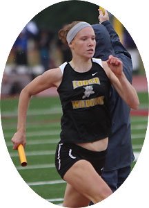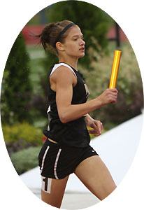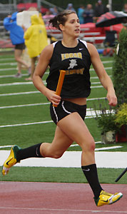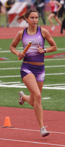 On the left anchor Tricia Serres a Platteville sophomore rounds the final turn of her leg.